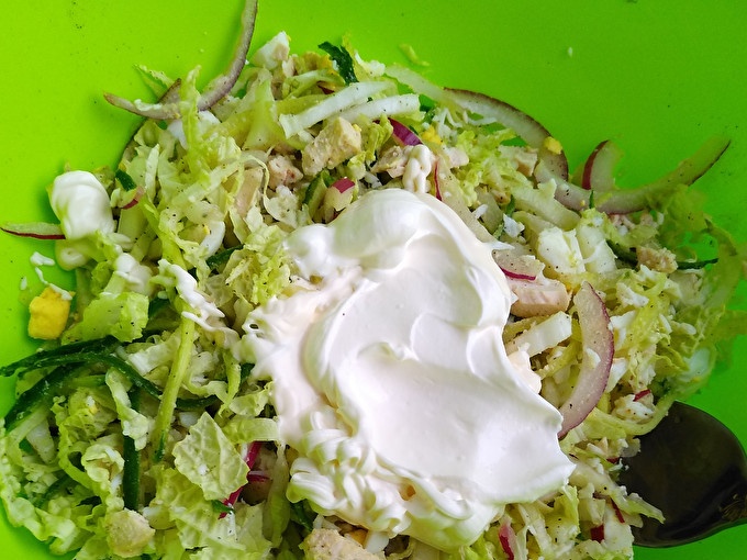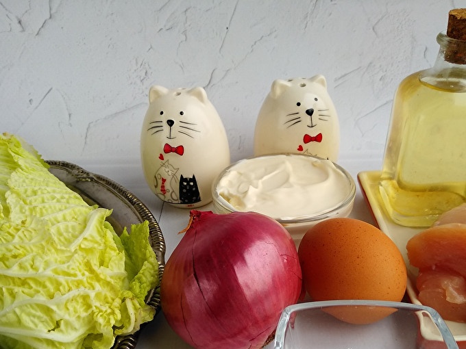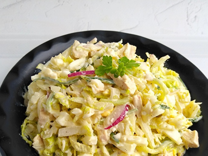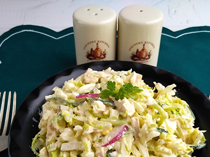 Sulīgums salāti dod dārzeņus. Izvēloties, pievērsiet uzmanību to svaigumam. Pekinas kāpostiem izmantojiet tikai lapu daļu. Ir svarīgi salātus piepildīt. Lielisks skābs krējums.
