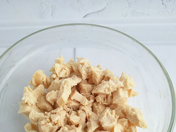 Šīs receptes galvenā gaļas sastāvdaļa ar pakāpeniskām fotogrāfijām ir vārīta vistas krūtiņa. Vārot, pievienojiet buljonā garšvielas un beigās to sāliet. Atdzesējiet vistu buljonā. Vistas filejas vietā jūs varat izmantot tītara fileju.