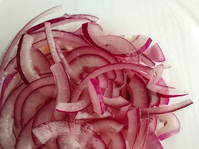 Sajauc 100 ml vārīta ūdens istabas temperatūrā ar etiķi un cukuru. Marinējiet sīpolu 7 minūtes.